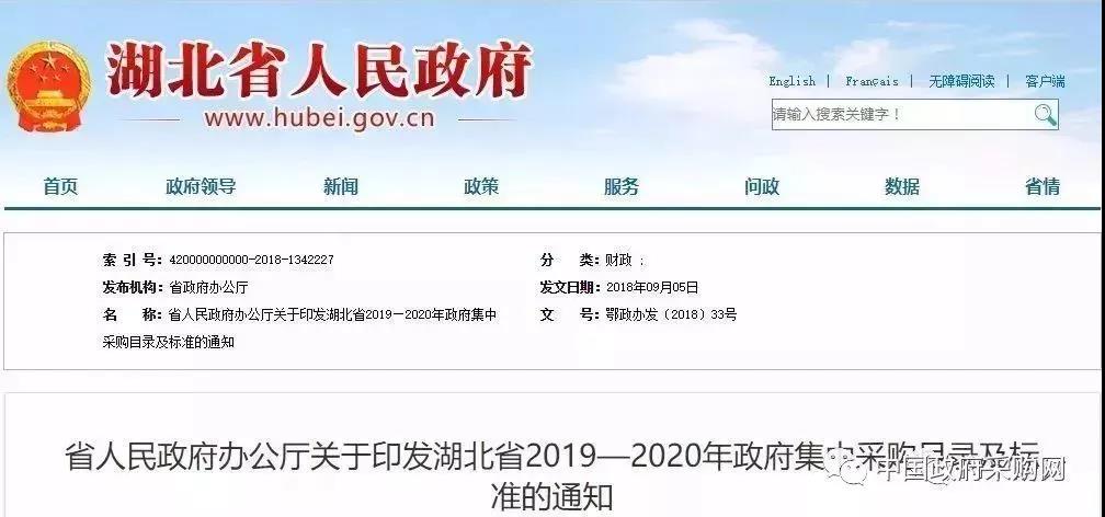 湖北省人民政府同样也发布《湖北省2019—2020年政府集中采购目录及标准的通知》。《目录及标准》在政府集中采购目录、分散采购限额标准、公开招标数额标准等方面作了调整。