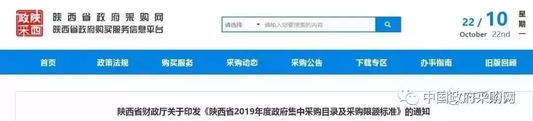 10月,陕西省财政局发布了《2019年度政府集中采购目录及采购限额标准》。