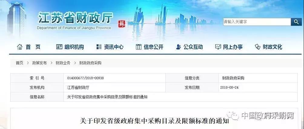 近日,江苏省财政厅发布《关于印发省级政府集中采购目录及限额标准的通知苏财购〔2018〕51号》。