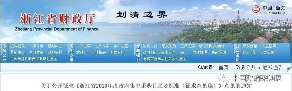 10月17日,浙江省财政厅发布《关于公开征求《浙江省2019年度政府集中采购目录及标准(征求意见稿)》意见的通知》。